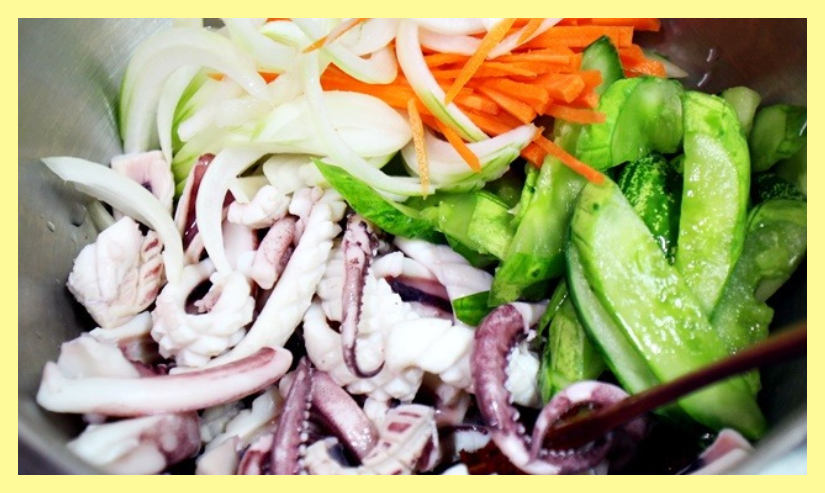 - 데친 오징어와 채소를 볼에 넣고